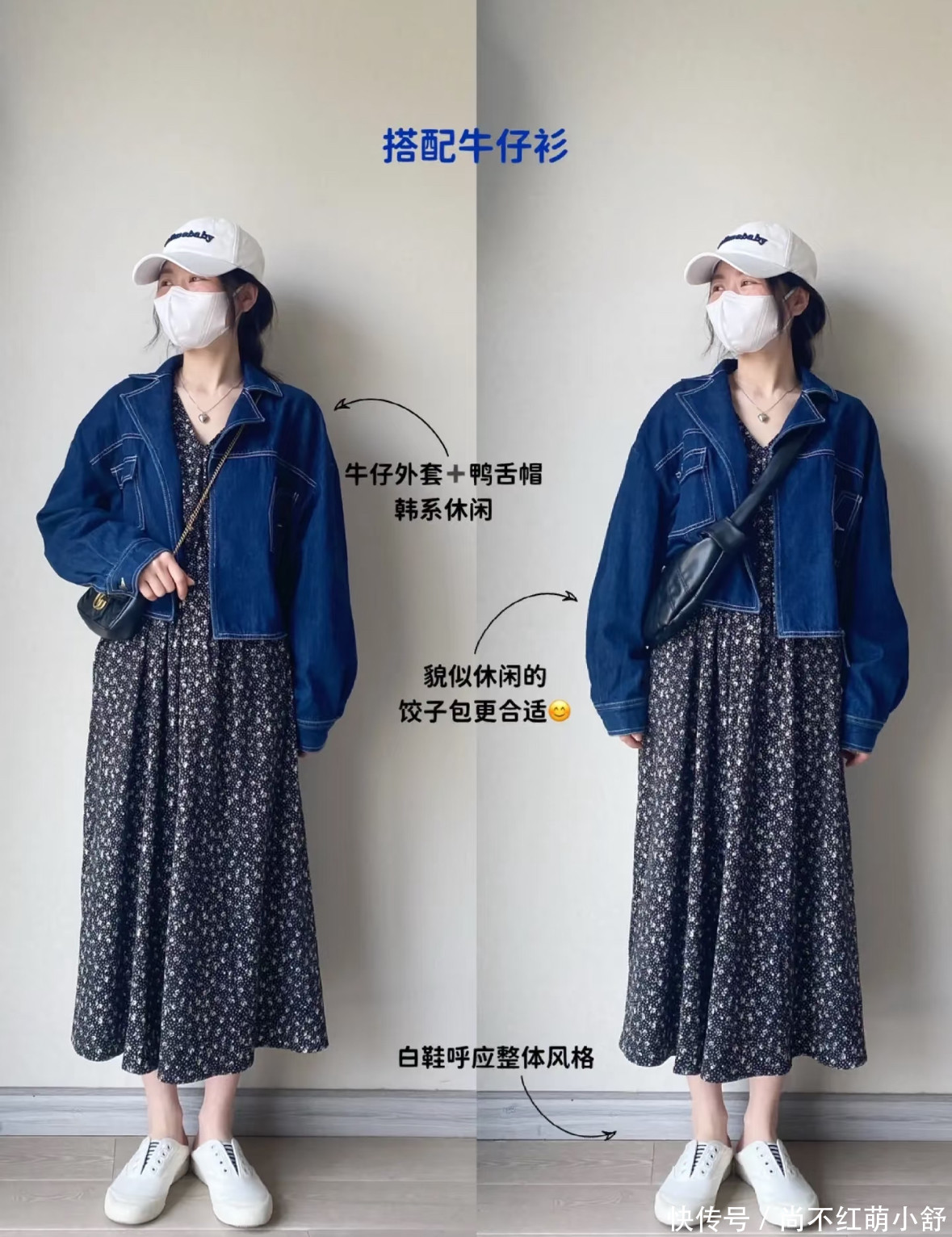 一条款式的黑白碎花裙搭配蓝色牛仔外套,休闲慵懒又时髦,喜欢韩系风格的女性,可以搭配白色鸭舌帽与白色的鞋子上下相呼应,整体色彩协调不突兀。
