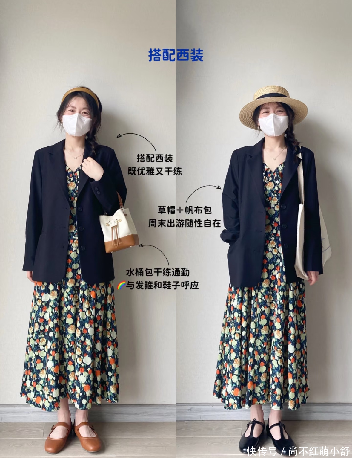喜欢干练优雅风格的女性,不妨选择彩色碎花搭配西装,需要注意,西装选择款式版型,与碎花的温柔结合,既不太正式又得体优雅,配饰利用草帽点缀,出游既随性又自在。
