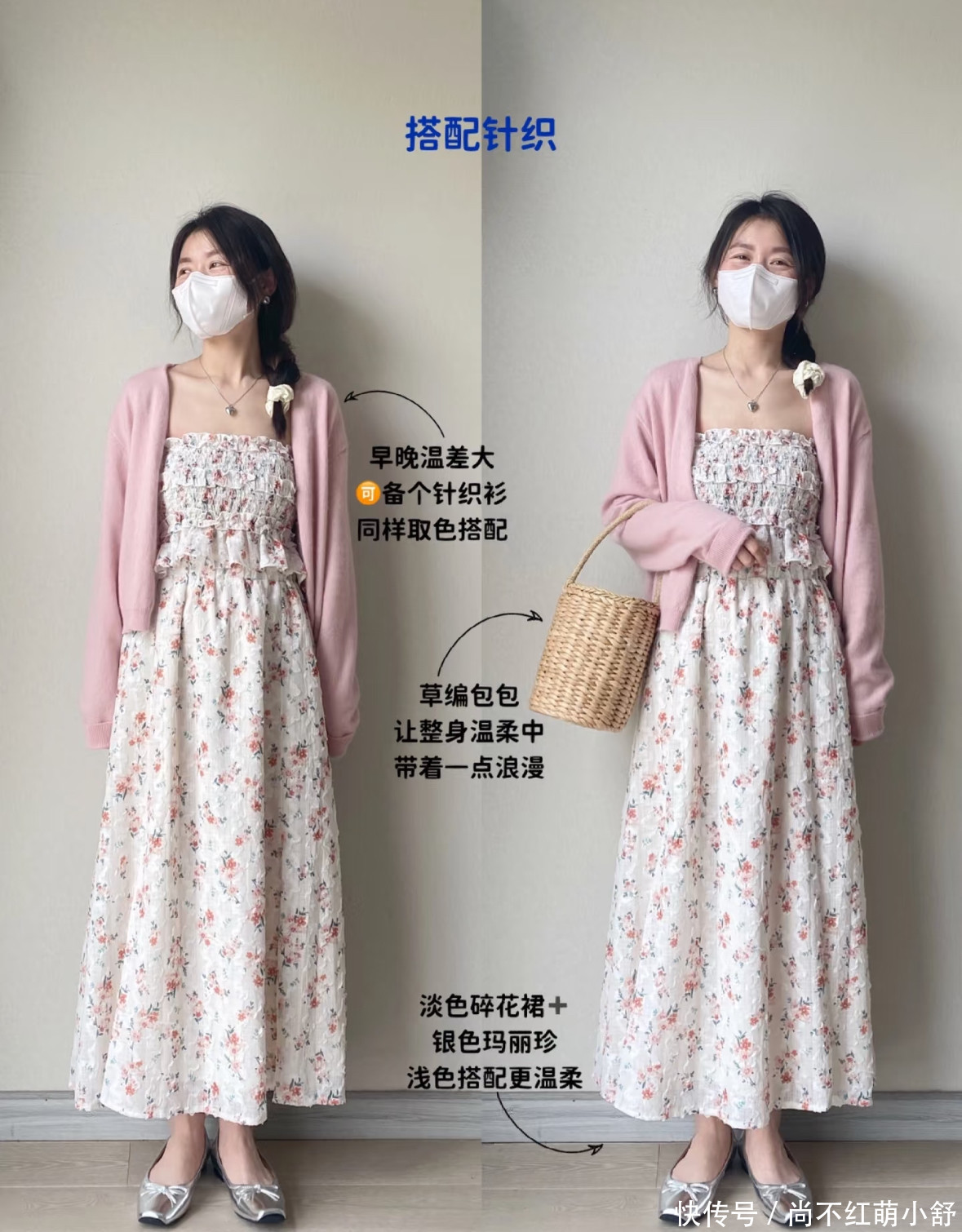 春天的天气早晚温差比较大,一条碎花裙搭配针织衫,真是保暖又惬意。看博主这套浅色碎花裙搭配粉色针织开衫,既温柔又气质,值得借鉴。