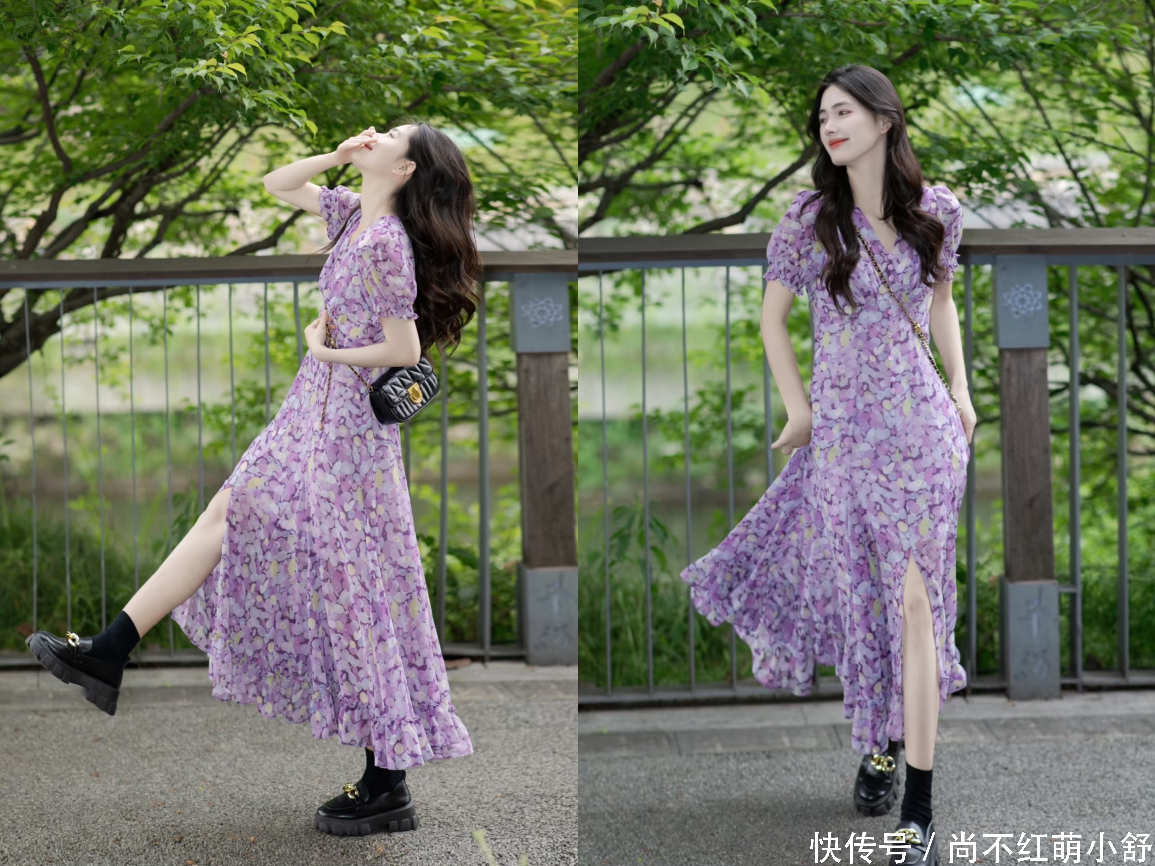 博主这条鲜艳夺目的紫色碎花裙,搭配一双黑色乐福鞋,和一个黑色的小包包,既时髦又高级。
