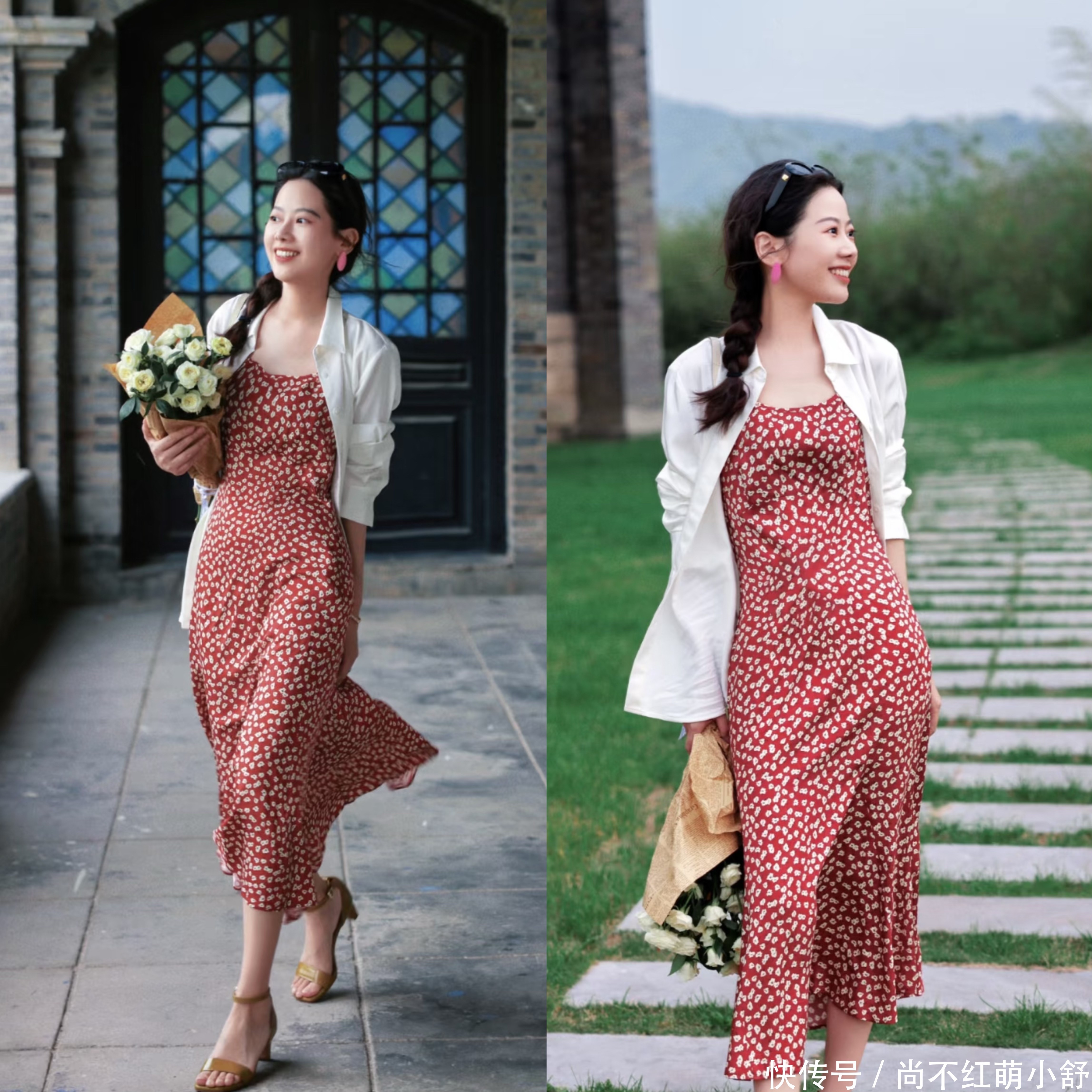 复古红色碎花裙修身又显瘦,利用白色衬衫平衡色彩,再搭配一双高跟鞋和精致的配饰,让自己在法式与复古风中更加迷人与自信。
